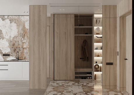 ● Особливості: господарська територія з рухом по колу спальня-гардероб-санвузол за прихованими дверима у вітальні, шпоновані панелі, спроектовані гардеробні шафи під особистий одяг власника, фасади кухні Fenix, верхні фасади кухні з керамограніту, плитка з імітацією каменю.